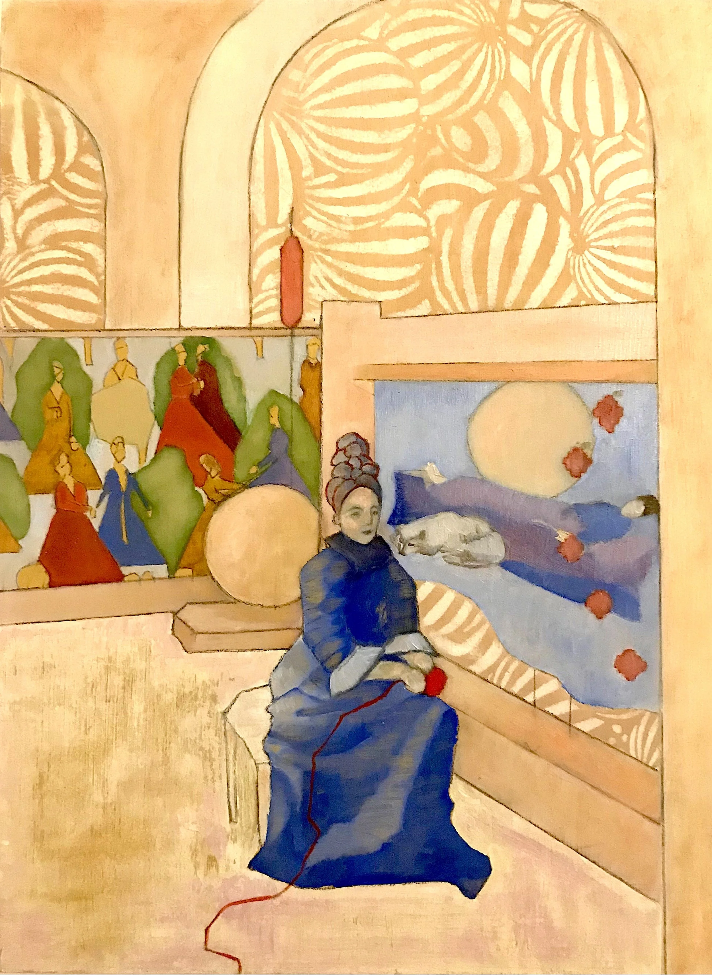In recent work, I am interested in depicting people moving, in blush colors, and montages of separate images that combine to tell a story.